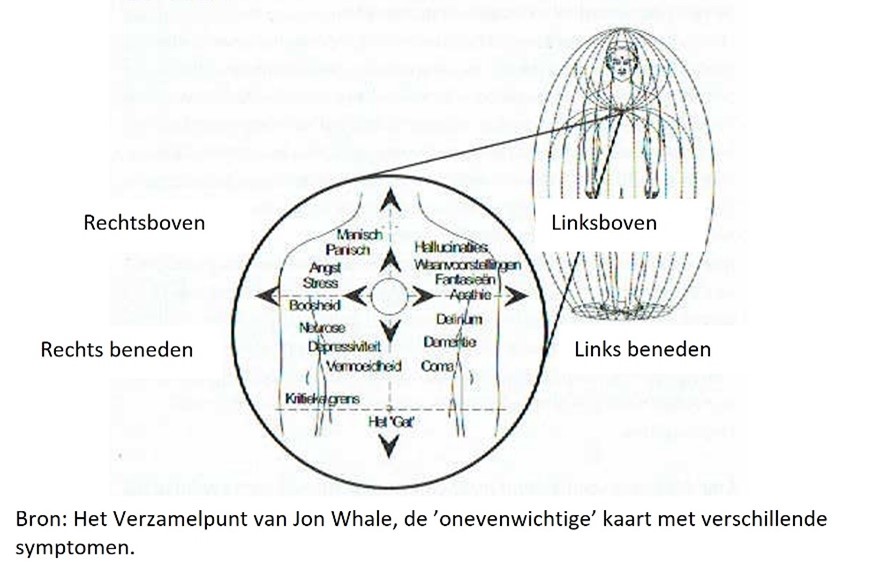 Veertien dagen later komt mevrouw met het bericht dat ze zich al veel beter voelt, dat de verzamelpuntcorrectie goed geholpen heeft. Ze kan weer functioneren. Opnieuw een check op verzamelpunt en schaduwverzamelpunt laat zien dat het verzamelpunt linksboven staat, 40 tot 45 graden, op waanvoorstellingen en fantasie en dat het schaduwverzamelpunt rechtsonder staat, op 45 graden, op neurose en depressiviteit.